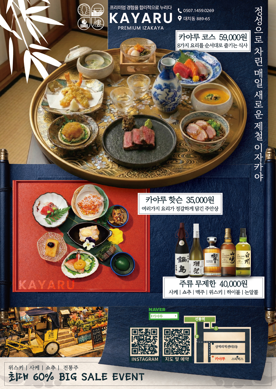 카야루 코스 59,000 | 카야루 핫슨 35,000 | 오스스메(오늘의추천메뉴) 변동가격(업주문의) | 주류무제한 30,000 | 후토마키 한줄 40,000 | 후토마키 하프 22,000 | 카마메시 45,000 | 츠쿠네 10,000 | 우자쿠(우나기초회)) 25,000 | 안심스테이크 30,000 | 마구로나또 28,000 | 1인 사시미 30,000 | 우니타마고 30,000 | 타이카부토니(도미머리조림) 45,000