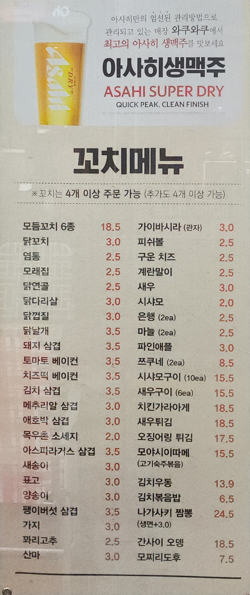 코젤다크생맥 7,500 | 기네스 마이크로520ml 13,900 | 감바스알 하히오 23,900 | 자파디페셰 토마토 스튜 26,000 | 글로벌수상한 논알콜수제맥주4종 9,900 | 미미라거(이벤트할인가격) 9,500 | 메리고라운드(이벤트할인가격) 9,500 | 몰디브수제맥주3종(수제맥주전문점) 7,500 | 부르바르오리지널 8,900 | 청담동며느리 7,900 | 머피스아이리쉬 7,900 | 스텔라생맥 8,500 | 하이네켄생맥 7,900 | 타이거생맥 7,500 | 에델바이스생맥 7,900 | 산토리 프리미엄 생맥주 8,900 | 하이볼.NON하이볼총30가지이상하이볼 변동가격(업주문의) | 40가지칵테일 변동가격(업주문의) | 바틀(위스키.몰트.리큐르.데낄라.진) 변동가격(업주문의) | 깐풍기치킨(다리)+감튀 16,900 | 순살후라이드치킨 15,900 | 옛날 치즈국물 떡볶이 10,000 | 마리게리따 12,900 | 고르곤졸라 13,500 | 보코치니 15,500 | 트러플 풍기피자 14,900 | 디아블로핏짜 15,500 | 초리조이베리코핏짜 16,900 | 후레쉬모짜렐라샐러드 9,900 | 살시차아푸미카타 26,800 | 프로슈토 누꼴라핏짜 26,900 | 비스테카루꼴라 25,900 | 포테이토핏짜 26,600 | 다양한세계맥주&소주 4,900 | 와인15종 변동가격(업주문의) | 감베리크레마 18,900 | 뉴욕 수제칠리치즈프렐치프라이 16,900 | NON,칵테일,수제맥주,하이볼 변동가격(업주문의) | 옛날통닭+감튀 13,900 | 치즈프렌치프라이 14,900 | 프랜치프라이 9,900 | 나초+치즈볼 13,900 | 먹태구이 15,900 | 한치+쥐포+땅콩 17,900 | 논알올칵테일 및 음료 3,000