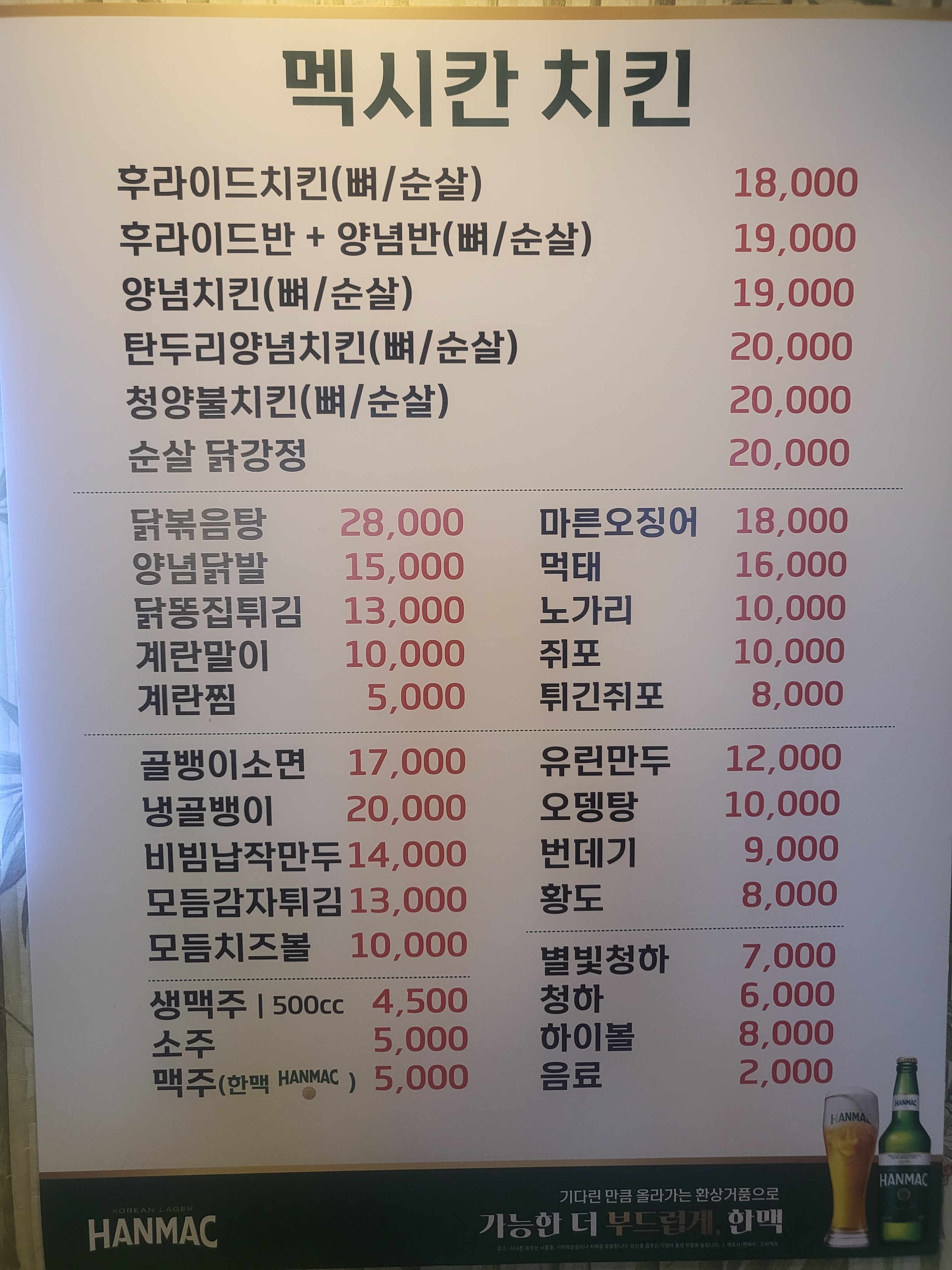 후라이드치킨 18,000 | 양념치킨 19,000 | 청양불치킨 20,000 | 닭볶음탕 28,000 | 닭똥집튀김 13,000 | 골뱅이소면 17,000 | 비빔납작만두 14,000 | 먹태 16,000 | 양념닭발 15,000 | 모듬치즈볼 10,000 | 모듬감자튀김 13,000 | 노가리 10,000 | 유린만두 12,000 | 오뎅탕 10,000 | 쥐포 10,000 | 튀긴쥐포 8,000 | 번데기 9,000 | 황도 8,000 | 냉골뱅이 20,000 | 계란말이 10,000 | 계란찜 5,000
