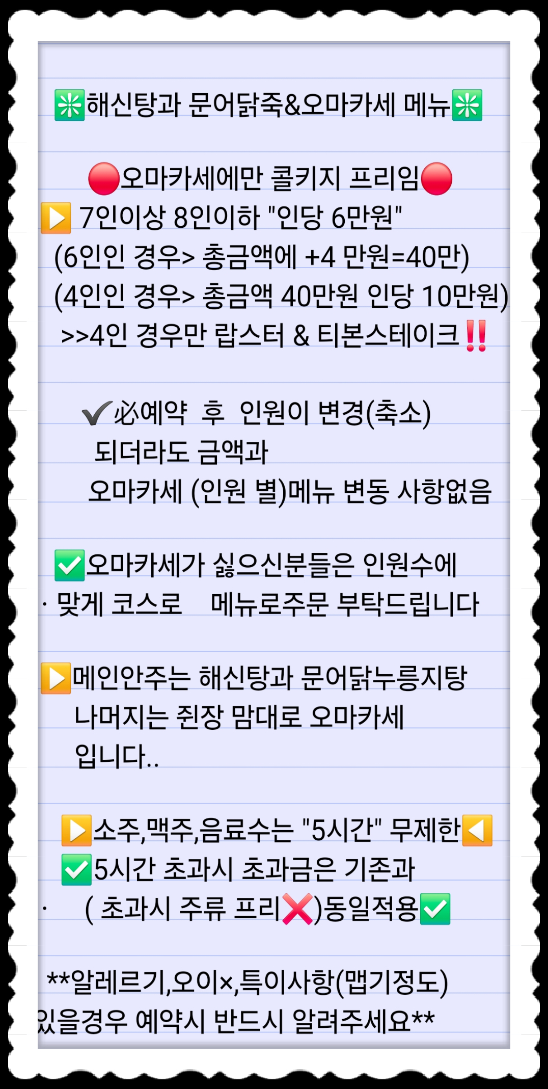 오마카세 변동가격(업주문의) | 해신탕&닭누릉지탕 140,000 | 메론하몽&치즈플래터(파티용) 64,000 | 메인해신탕+닭죽+술&💜오마카세💙 변동가격(업주문의) | (✅️신메뉴)백상합 술찜🦪 23,000 | 갈낙탕 130,000 | 토마토(신메뉴) 12,000 | 킹타이거새우 & 매쉬포테이토(양적음) 35,000 | 🐙문어뽈뽀 & 매쉬포테이토(신메뉴) 38,000 | 오이탕탕이 (신메뉴✅️) 8,000 | 멜론하몽(파티용) 43,000 | 인기💚생자몽하이볼(무알콜) 28,000 | 얼큰 해장 해물뚝배기 파스타 39,000 | 토마호크 스테이크 650g(2인정도) 120,000 | 추천메뉴A(5인 정도) 165,000 | 추천세트B(4인 정도) 160,000 | 추천메뉴C세트(4인 정도) 150,000 | 추천메뉴D(3인정도) 165,000 | A세트(3인정도) 135,000 | B세트(소식좌3인정도) 135,000 | C세트(소식좌3인정도) 130,000 | D세트(소식좌3인정도) 120,000 | E세트(소식좌3인정도) 120,000 | F세트(소식좌3인 정도) 130,000 | 명란구이까나페 36,000 | 해물오뎅탕 48,000 | 버섯만두전골 46,000 | 닭도리탕(맵기 必 요청!!!) 39,000 | 낙지 &새우탕 48,000 | 간장새우 32,000 | 치즈떡갈비구이(신메뉴) 39,000 | 관자&새우버터구이 39,000 | 관자새우버터구이&치즈떡갈비구이(신메뉴 75,000 | 새우아라비따토마토스파게티 26,000 | 매콤콩나물불고기 35,000 | 해물찹스테이크 42,000 | 연어 리코타치즈 샐러드 32,000 | 문어&새우 샐러드(신메뉴) 32,000 | 골뱅이무침과 소면 35,000 | 새우야채 모듬소세지 23,000 | 새우감바스 32,000 | 주전부리세트 40,000 | 김치볶음밥(2인분) 23,000 | 해물소스계란말이 35,000 | 💚당일주문가능)해물라면(2인) 22,000 | 💚당일주문가능)새우짜파게티(2인분) 20,000 | 💚당일주문가능)버터반건오징어 23,000 | 💚당일주문가능)먹태 23,000 | 💚당일주문가능)튀김쥐포 10,000 | 💚당일주문가능)마늘빵과 고구마깡 20,000 | 겉절이김치 9,000 | (여름)열무국수 18,000 | 소주,맥주 6,000 | 한라산21도,별빛청하,청하 7,000 | 일품진로 40,000 | 일품진로 언더락 세트 45,000 | 한라토닉 30,000 | 외부 주류 (양주,사케 등..) 변동가격(업주문의) | 외 주류(막걸리,무알콜,켈리,테라등등 변동가격(업주문의) | 와인 콜키지 병당 15,000 | 각종 음료수,블랙커피,헛개수 3,000 | 토닉워터,탄산수플레인 3,000 | 레몬슬라이스+얼음 셋팅 8,000 | 깔라만시 원액 200ml 6,000 | 컨디션 5,000